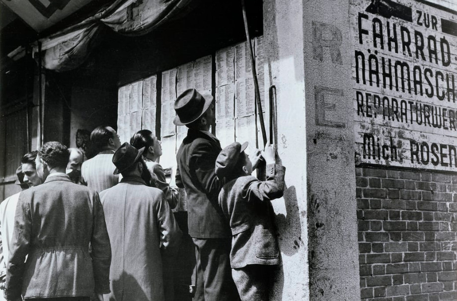 پناهندگانی که اسامی بازماندگان جنگ را نگاه می کنند (شانگهای)