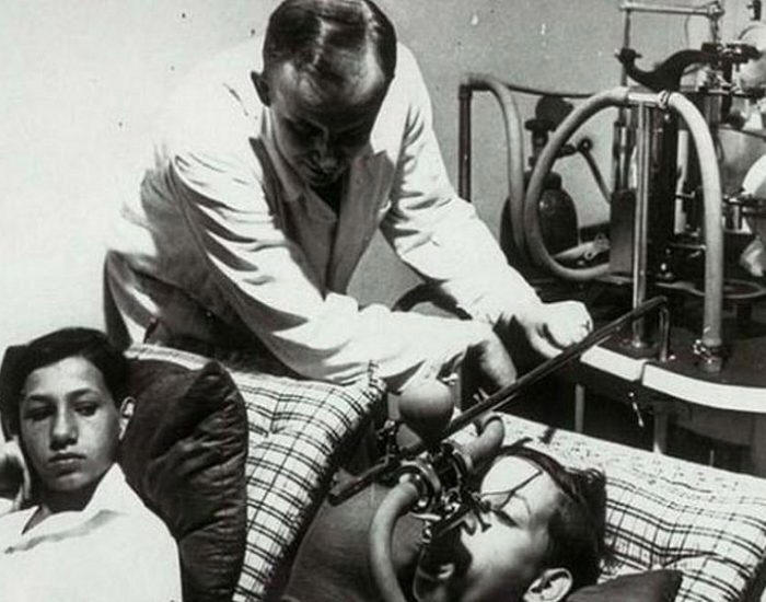 یوزف منگله در حال آزمایش روی اسیران جنگی در اردوگاه آشویتس