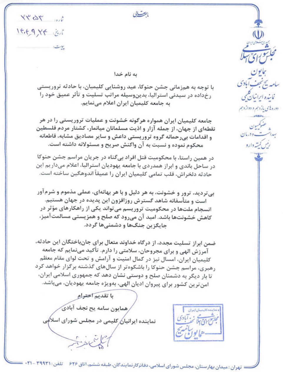 محکومیت حادثه تروریستی و یهودستیزانه سیدنی توسط نماینده کلیمیان ایران