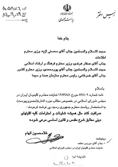 با سلام و احترام و ضمن عرض تبريك مجدد خود و جامعه كليميان ايران به مناسبت انتخاب جنابعالي بعنوان رياست جمهور كشور عزيزمان ايران و ضمن آرزوي قبولي طاعات و عبادات شما در اين ماه مبارك به استحضار مي رساند اينجانب طي دوره مجلس ششم و دوره هفتم كه افتخار نمايندگي جامعه خود در مجلس را به عهده داشته ام بارها در نطق هاي قبل از دستور و طي مكاتبات و مراجعات مستقيم به مقامات مسئول مملكت اعتراض خود و جامعه كليميان ايران را نسبت به چاپ كتب و مقالات و يا تهيه برنامه ها يا سريال هاي تلويزيوني كه در پوشش ضديت با صهيونيسم، افكار يهودي ستيزانه خود را به منصه نمايش گذارده و اقدام به توهين به شعائر ديني و اخلاقي يهوديان نموده و بدين وسيله ضمن آزردن خاطر يهوديان ايراني كه طي 2700 سال تاريخ حضور خود در اين مملكت همواره مراتب وطن پرستي، عشق به اين آب و خاك و علاقه به ساير هموطنان را به اثبات رسانيده اند، باعث تحريك افكار و هيجانات آن دسته از افرادي بوده اند كه ديگ احساس شان با خواندن اينگونه مقالات تماشاي سريال هاي يهودي ستيزانه به جوش آمده و ناخودآگاه ممكن است باعث بروز اعمالي بشوند كه حتما خواسته و ميل نظام نمي باشد و بويژه كه اخيرا در برنامه سريال هاي تلويزيوني مربوط به ماه رمضان شاهد پخش سريالي هستيم كه تماما خطاب و حمله آن به سوي يهوديان مي باشد. لذا با توجه به ديدگاه هاي حضرت امام راحل كه براي اولين مرتبه فرمودند: «ما حساب يهوديان را از صهيونيسم جدا مي دانيم.» و با توجه به ديدگاه مقام معظم رهبري و ساير مسئولان نظام كه در تائيد نقطه نظرهاي امام راحل در ارتباط با جامعه يهوديان مي باشند، تقاضا دارم ترتيبي اتخاذ فرمائيد تا در چاپ كتب، مقالات، سخنراني هاي و يا تهيه سريال هاي تلويزيوني رعايت شئونات جامعه كليميان ايران و احترام به حقوق حقه آنان بعمل آمده و اجازه ندهند تا بيش از اين براي رسانه ها و شبكه هاي ماهواره اي خارج از كشور خوراك تبليغاتي ايجاد شود.