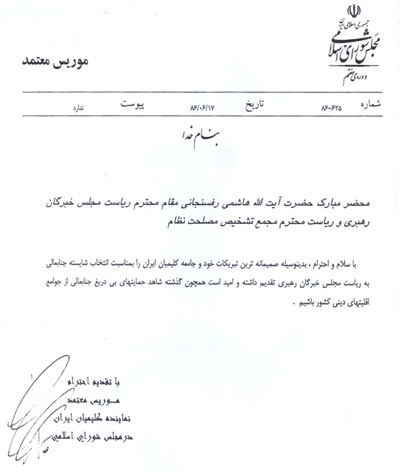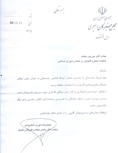 پیرو برگزاری انتخابات مجلس خبرگان رهبری و انتخاب شایسته آیت‌ا... هاشمی رفسنجانی به ریاست این مجلس، موریس معتمد نماینده جامعه کلیمیان در مجلس شورای اسلامی پیام تبریک خود و جامعه کلیمیان ایران را تقدیم ایشان داشتند که عین نامه و جواب آن از سوی دفتر ایشان به نظر خوانندگان محترم می‌رسد.
