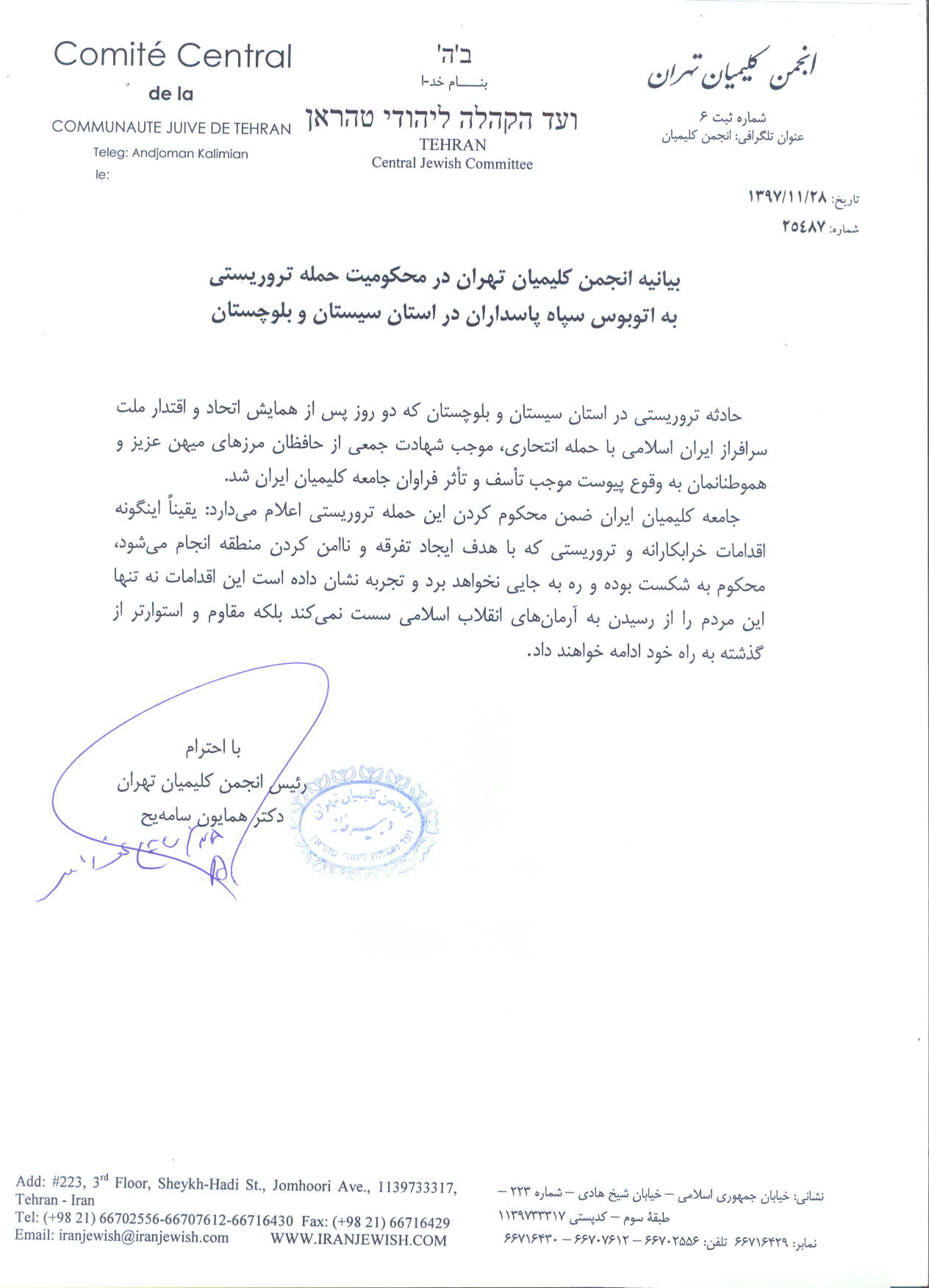 حادثه تروریستی در استان سیستان و بلوچستان که دو روز پس از همایش اتحاد و اقتدار ملت سرافراز ایران اسلامی با حمله انتحاری، موجب شهادت جمعی از حافظان مرزهای میهن عزیز و هموطنانمان به وقوع پیوست موجب تأسف و تأثر فراوان جامعه کلیمیان ایران شد.