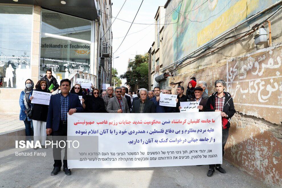 کلیمیان کرمانشاه با تجمع مقابل کنیسه ی وحدت با سردادن شعارهایی اعتراض خود را علیه جنایات رژیم صهیونیستی فریاد زدند. به گزارش ایسنا، حاضران در این تجمع اعتراضی با در دست داشتن دست نوشته‌ها و پلاکاردهایی با مضامینی شامل«به نام یهودیت جنایت نکنید»، «حساب یهودیت از صهیونیسم جدا است»، «ماخواستار آتش‌بس فوری هستیم» و «ما هرگونه کشتار کودکان، زنان و افراد بی دفاع را محکوم می‌کنیم» جنایات رژیم اسراییل را محکوم کردند. کلیمیان استان کرمانشاه همچنین با در دست داشتن دست نوشته هایی با مضمون «باید حضور فساد برانگیز آمریکا در منطقه برچیده شود» خواستار حذف دخالت های آمریکا در امور دیگر کشورها شدند.