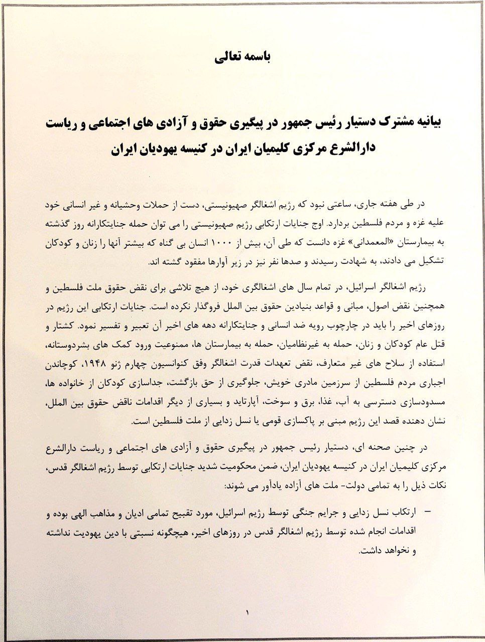 اینجانبان، نمایندگان جوامع ادیان الهی در مجلس شورای اسلامی با محکومیت شدید تمامی جنایات این رژیم به خصوص قتل عام اخیر بیمارستان المعمدانی و کشتارهای کور روزهای اخیر، حمایت خود و جوامع خود را از مردم حق‌جوی فلسطین اعلام می‌نماییم و از جهانیان می‌خواهیم فارغ از منافع و حسابگری‌ها، وظیفه ی انسانی خود که بنیاد امنیت و صلح را تشکیل می‌دهد، به فراموشی نسپارند.