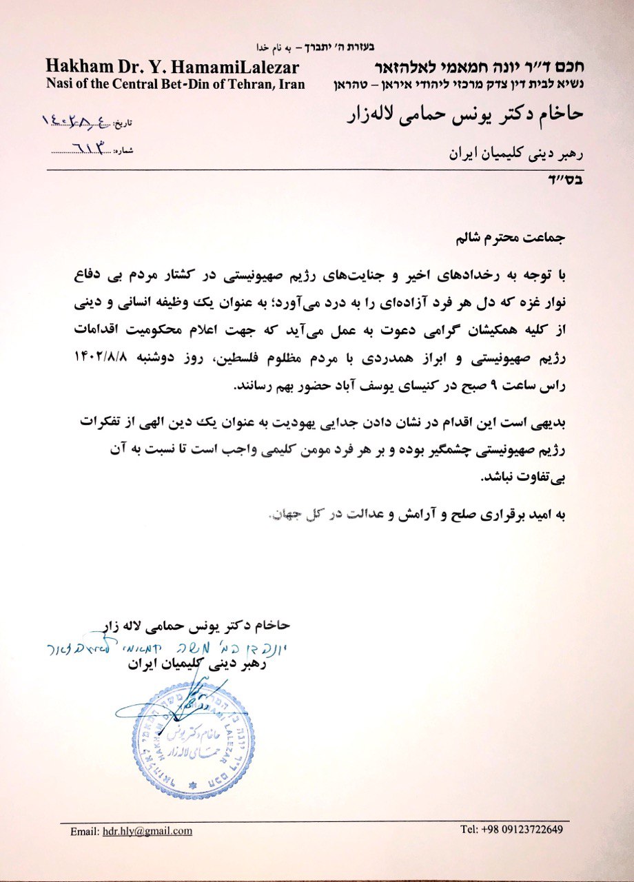 از این رو بنا به اهمیت موضوع، به پیشنهاد رهبر دینی ایرانیان کلیمی (جناب حاخام دکتر یونس حمامی لاله‌زار)، بنده و جمع کثیری از فعالین اجتماعی، مراسمی جهت محکومیت نسل کشی مردم مظلوم غزه در روز دوشنبه مورخ 8 آبان ساعت ۹ صبح در محل کنیسای یوسف آباد برگزار می‌گردد.