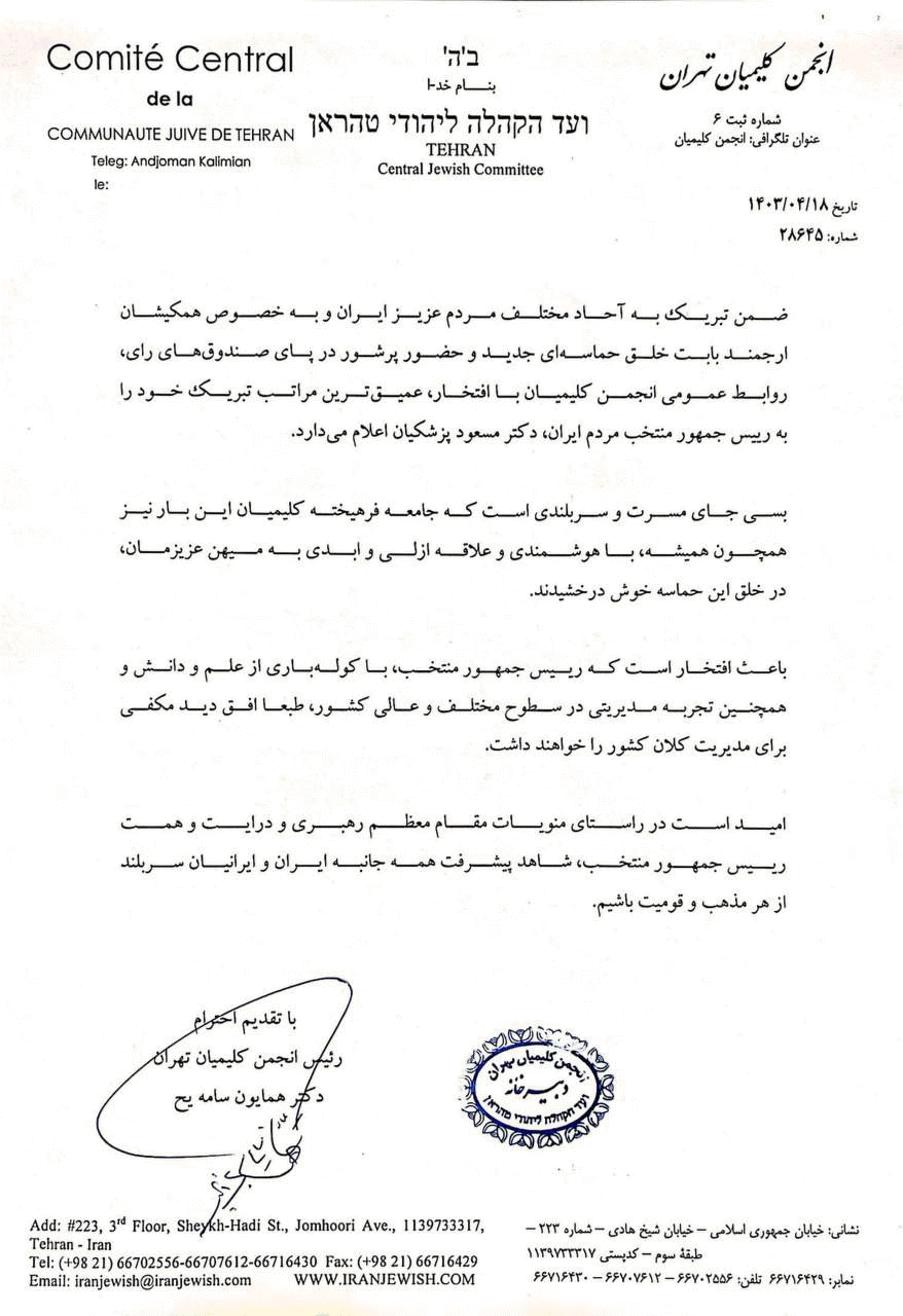 تبریک انجمن کلیمیان تهران به رییس جمهور منتخب جمهوری اسلامی ایران