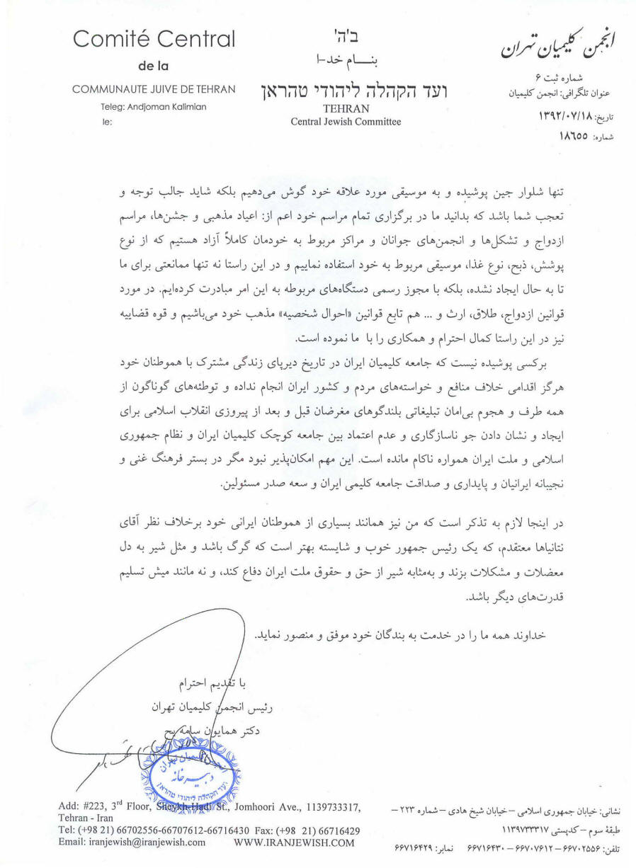 نامه رییس انجمن کلیمیان تهران در حمایت از دولت روحانی و اعتراض به سخنان نتنیاهو