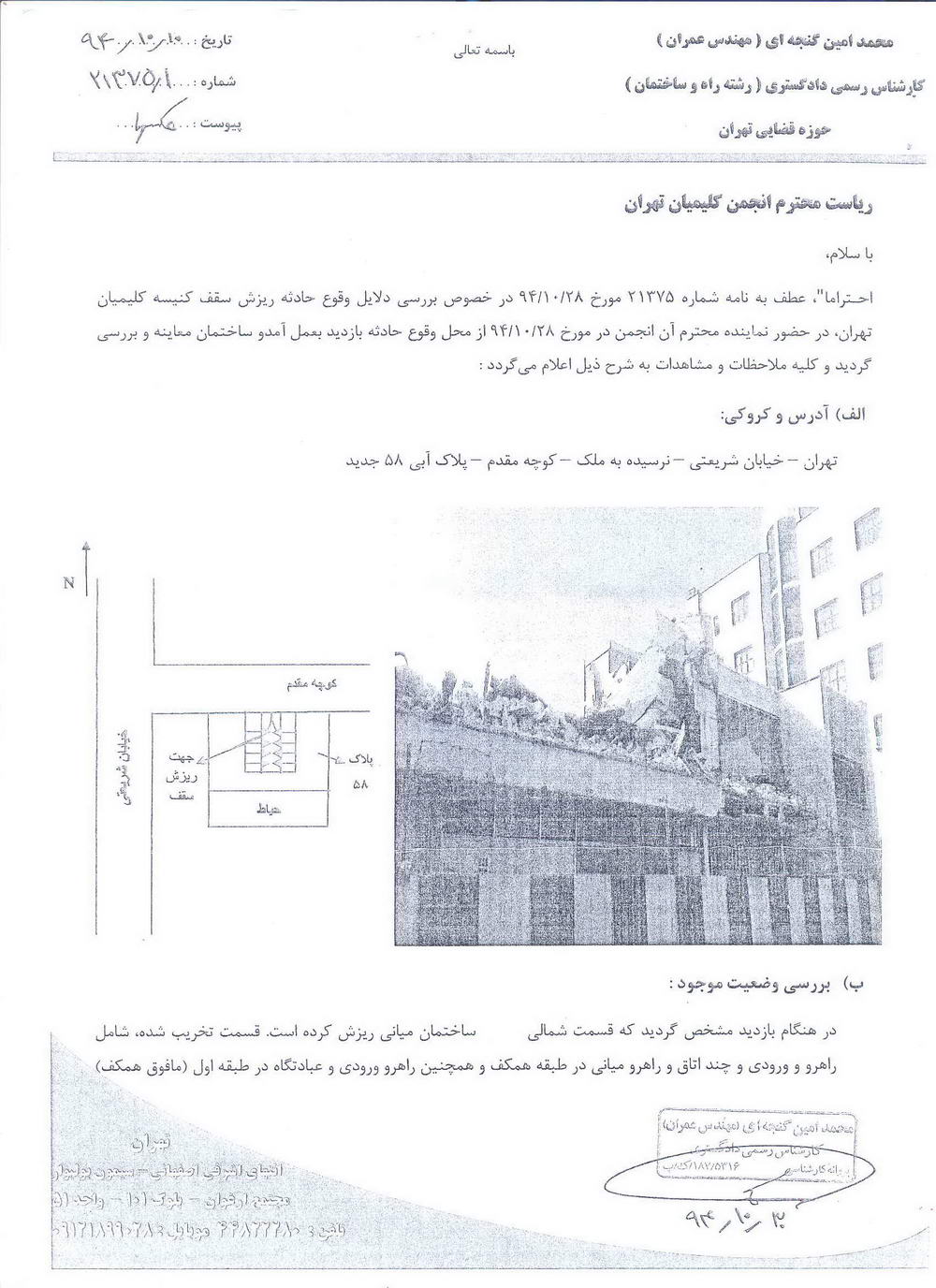 گزارش کمیته املاک انجمن کلیمیان تهران در مورد ریزش کنیسای باغ صبا و عملیات انجام شده