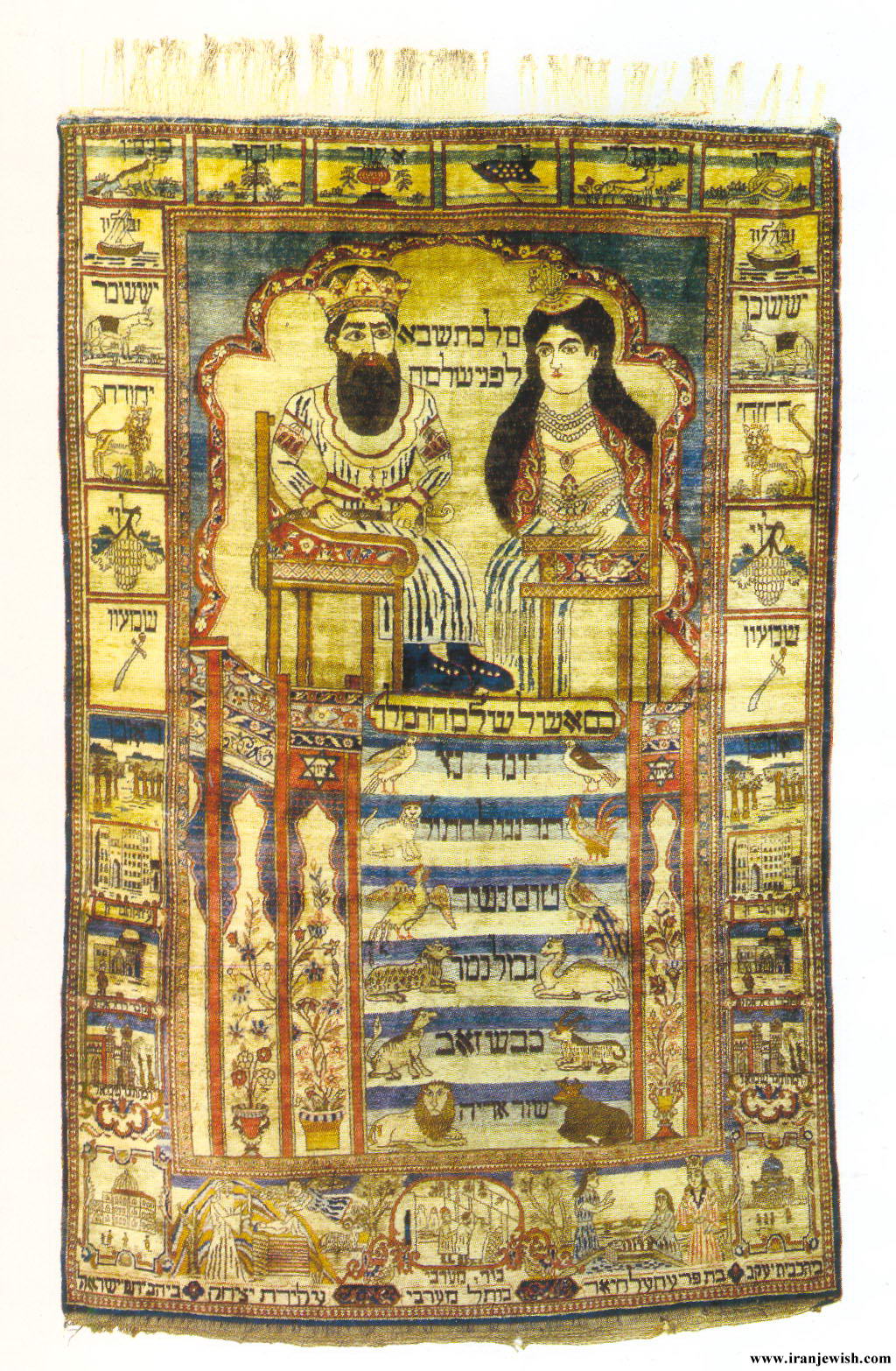 فرش دست بافت ابریشمی کاشان 1850 میلادی حضرت سلیمان و ملکه صبا بر روی تخت حضرت سلیمان که دارای شش پله بوده. در حاشیه فرش نیز تاریخ بنی اسرائیل بطور مصور آمده است. و همچنین سنبلهای دوازده پسران حضرت یعقوب آمده است. ابعاد: 197X135 سانتی متر