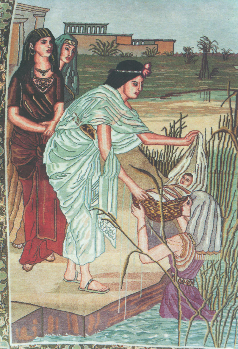 گرفتن گهواره حضرت موسی از رود نیل توسط دختر فرعون اندازه: 78× 105 سانتی‌متر، تار: ابریشم، رج‌شمار: 70، پود: نخ، محل بافت: قم، پرز: ابریشم. (ادب و عرفان در قالی ایران، سیدرضا خشکنابی، انتشارات سروش، 1378)