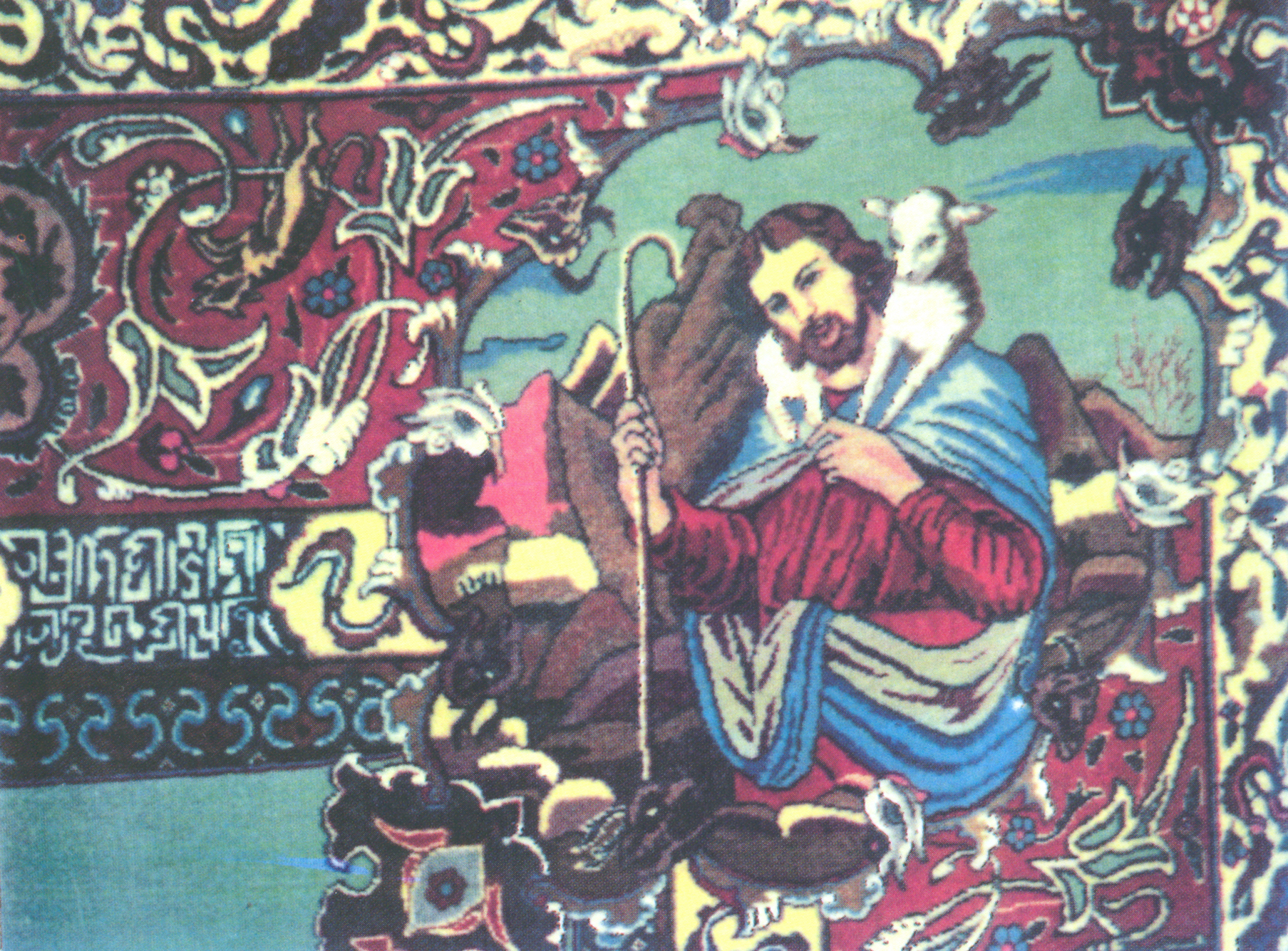 اندازه: 300×200 سانتی‌متر، نوع گره: متقارن، رج‌شمار: 60 تار: ابریشم، محل بافت: تبریز، پرز: پشم درجه 1 (تصویر نشان‌دهنده گوشه‌ای از قالی است) صحنه شبانی کردن حضرت موسی برای حضرت شعیب «مضمون آیه‌های 27 و 28 از سوره مبارکه قصص» (ادب و عرفان در قالی ایران، سیدرضا خشکنابی، انتشارات سروش، 1378)