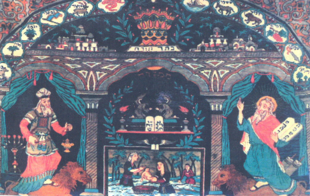3. در قسمت بالا دو فرشته بالدار روبروی هم روی تخت فاخری قرار دارند. دو شمعدانی منور در پشت سر آنان ملاحظه می‌شود. لوحه‌ای به خط عبری در وسط فرشتگان نهاده شده در سایر صحنه‌ها نیز از همین خط استفاده شده است. چنان‌چه این خطوط خوانده و ترجمه شود به ارزش این اثر هنری افزوده خواهد شد.
