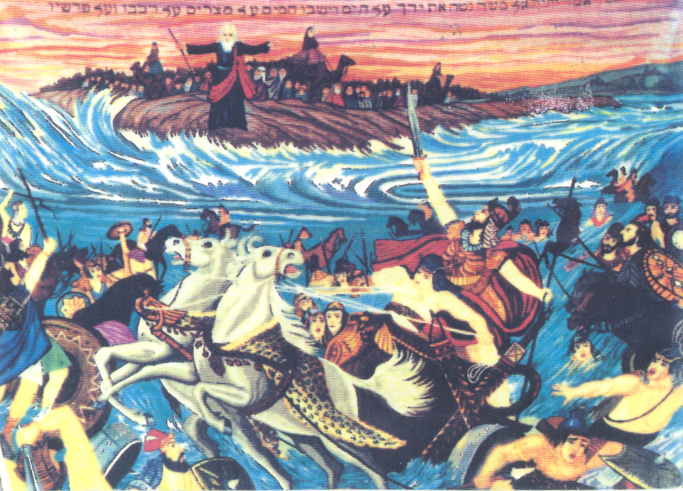 تعقیب فرعون و سپاهیان او حضرت موسی و قوم بنی‌اسرائیل را تا رود نیل و یا به روایت تاریخ انبیا: بحر احمر اندازه: 170×190 سانتی‌متر، تار: ابریشم، رج‌شمار: 50، پود: نخ، محل بافت: تبریز، پرز: پشم درجه 1، بافنده: جودی تجسم صحنه دو طرف رودخانه در این تابلو، دست به گریبانی فرعون و لشکریانش را با امواج سهمگین رودخانه و غضب الهی کاملاً نشان می‌دهد. به طوری که مشاهده می‌شود حضرت موسی و قومش، که به سلامت از رود گذشته‌اند، هلاکت فرعونیان را تماشا می‌کنند. (ادب و عرفان در قالی ایران، سیدرضا خشکنابی، انتشارات سروش، 1378)
